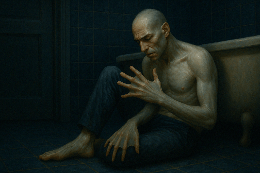 Les jours passèrent. Ethan ne travaillait plus. Il avait cessé d’ouvrir son ordinateur, ignorait les appels, laissait les mails s’accumuler sans même y jeter un œil. Le monde extérieur lui semblait désormais aussi lointain qu’inutile. Il restait enfermé dans son grand appartement, les volets fermés en permanence. La lumière du jour l’épuisait, lui brûlait presque la peau. Il passait le plus clair de son temps allongé dans la baignoire, remplie à ras bord d’eau froide. Parfois, il restait ainsi des heures, immobile, les yeux mi-clos, ne bougeant que pour glisser un peu plus bas sous la surface. L’eau était devenue son refuge, la seule chose qui l’apaisait. Lorsqu’il en sortait, sa peau suintait encore d’humidité, refusant de sécher complètement. Il grelottait dès qu’il restait trop longtemps hors de l’eau, comme si son corps rejetait désormais l’air sec. Rachel venait parfois s’asseoir sur le rebord de la baignoire, cherchant à lui parler, à le ramener à elle.