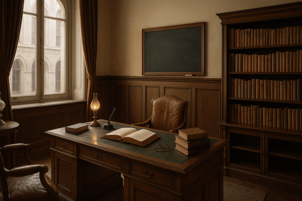 Je ne sais pas comment j’ai atterri là. Un amphithéâtre ancien, boiseries sombres, odeur de papier et de craie froide. Dehors, une lumière pâle traverse les vitres. La Sorbonne, je crois. Ou une idée de la Sorbonne. Un homme m’attend. Assis derrière un bureau trop large. Il ajuste ses lunettes, se lève lentement, puis me tend la main. Je reconnais son visage : barbe fournie, regard concentré. Émile Durkheim, en chair et en rêve.